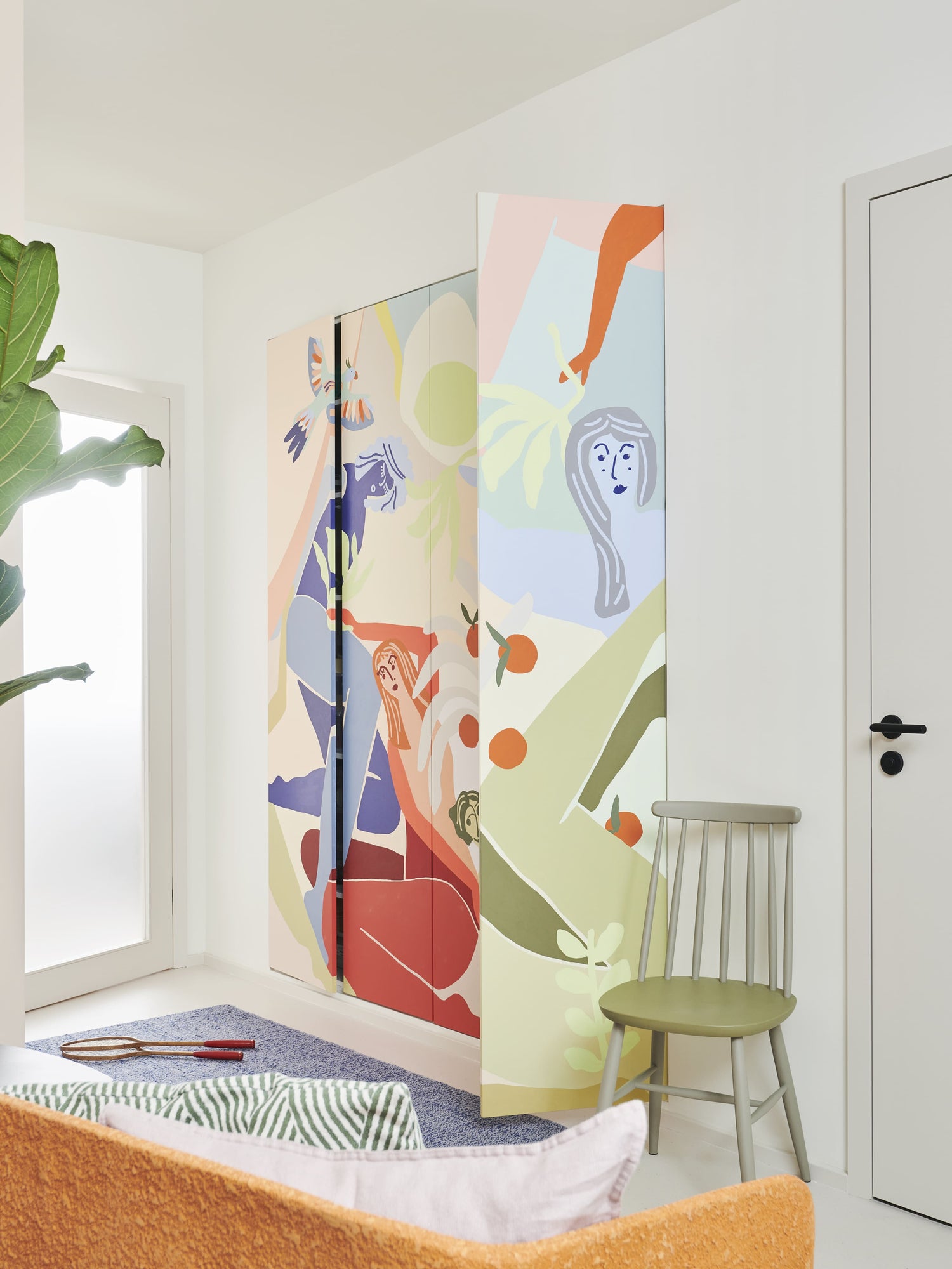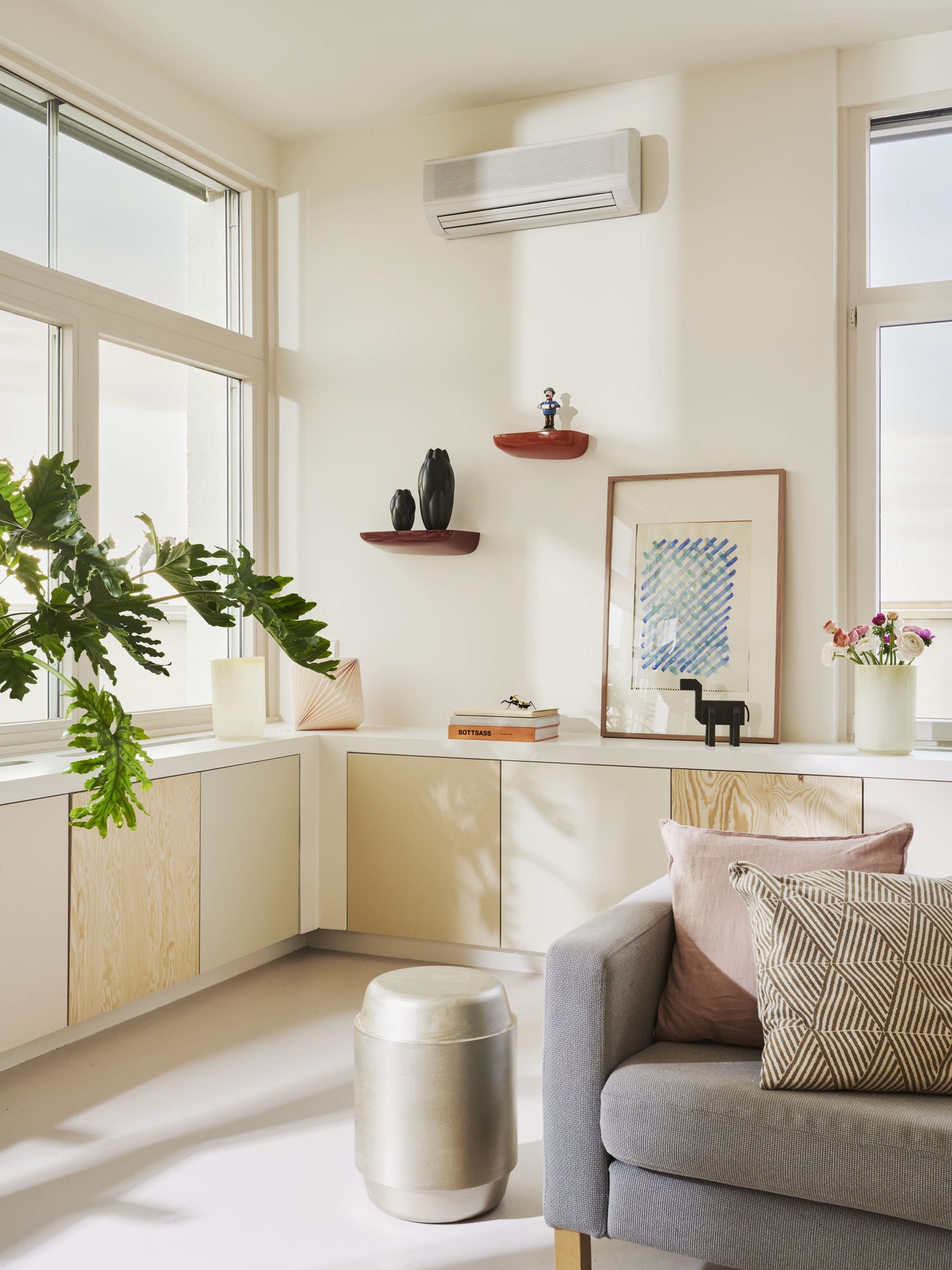 Optisches Highlight der Wohnung ist das Kunstwerk auf dem eingebauten Wandschrank im Wohnzimmer. Das Kunstwerk aus 30 Farbtönen zeigt auf eindrucksvolle Weise, dass die Kollektion von CAPAROL ICONS eine harmonische Sammlung brillanter Farben ist, die den individuellsten Bedürfnissen gerecht wird und deren Farben sich perfekt kombinieren lassen.