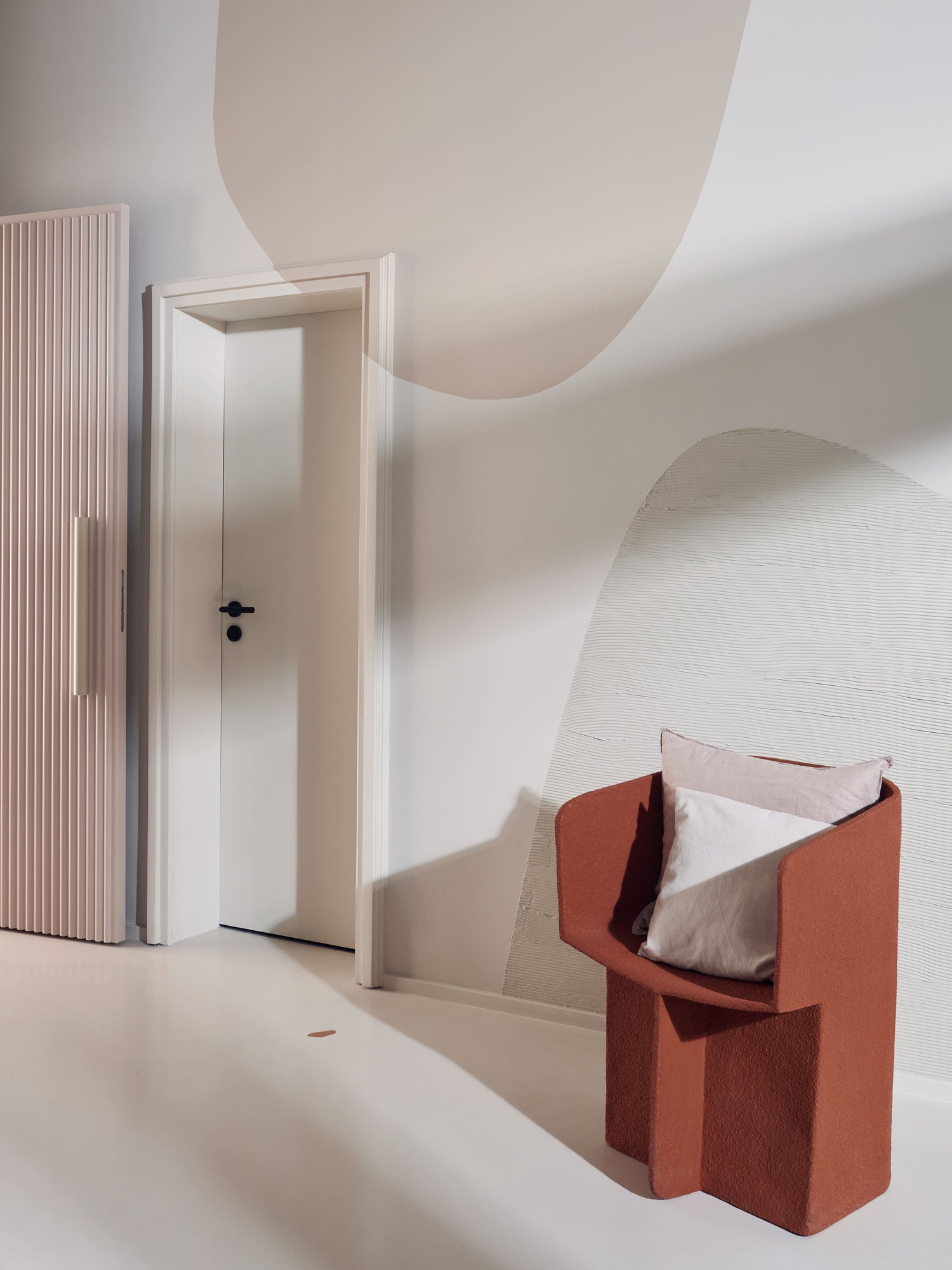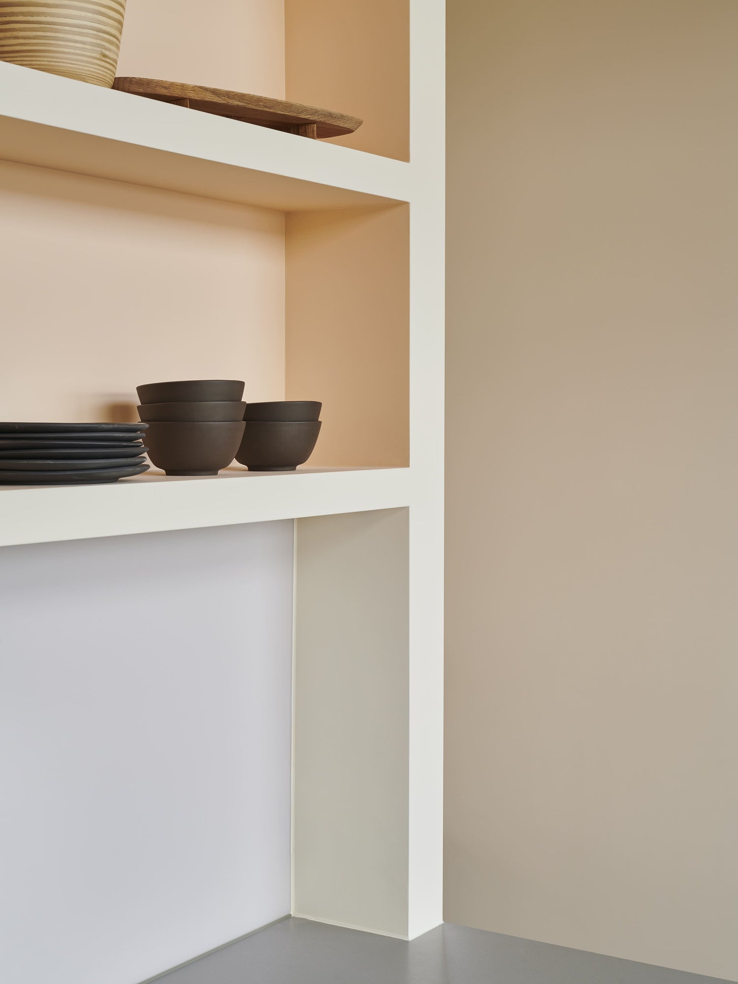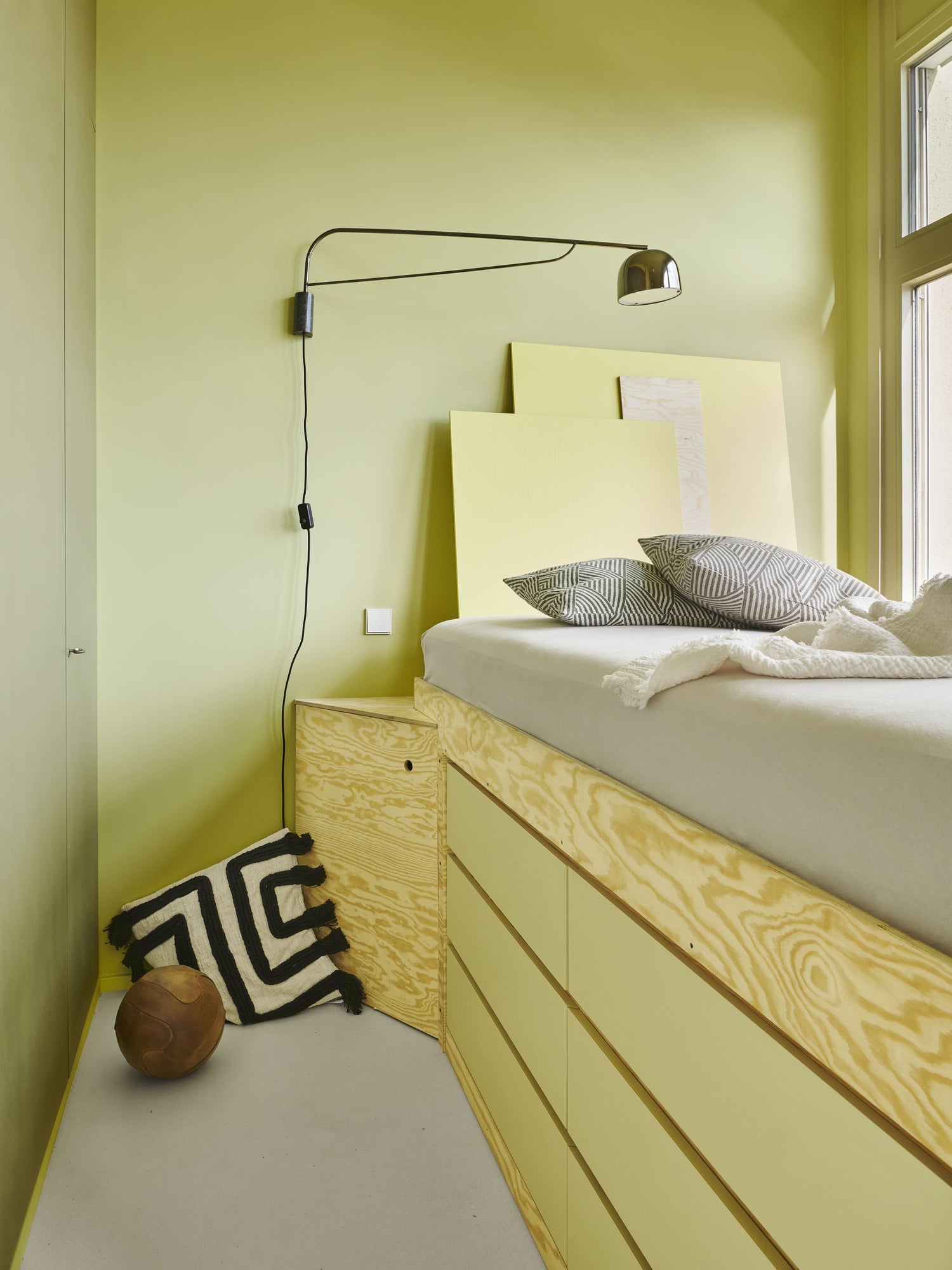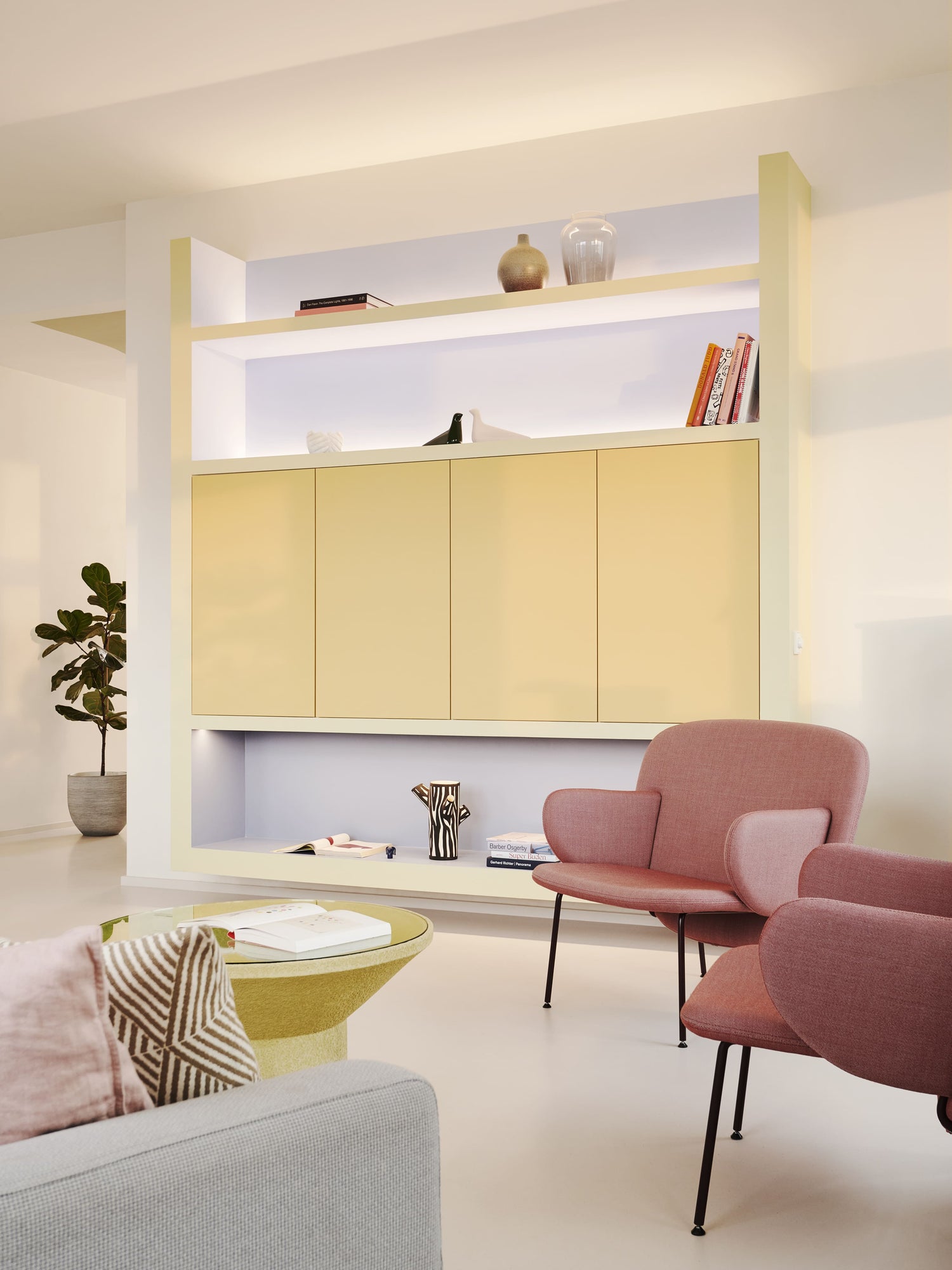 „Das Farbkonzept verfolgt unterschiedliche Ziele und Gedanken, da wir bei der Gestaltung das Thema Farbe nicht eindimensional denken wollten. Hebt es an der einen Stelle sichtbar hervor, homogenisiert es an anderer Stelle Flächen und Möbel. Zum Teil verläuft ein Farbton auch von der Wand über Decke und Tür hin zu einem Möbelstück, oder die Farbe spiegelt sich in einer Schattierung von Einbauregalen. Trennt man sich einmal von der Vorstellung, dass Farbe nur in einer Nuance auf die Wand gehört, eröffnen sich unzählige Möglichkeiten“, so Kilian Schindler._