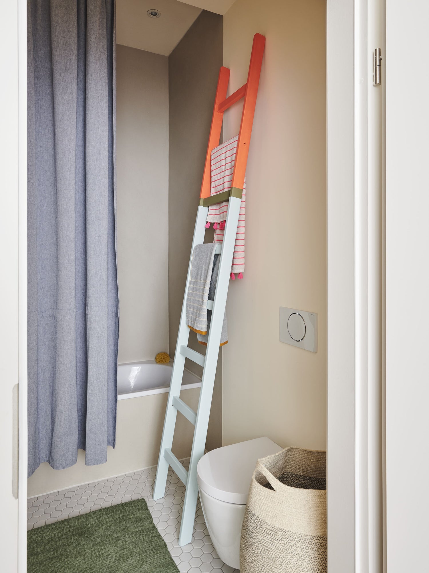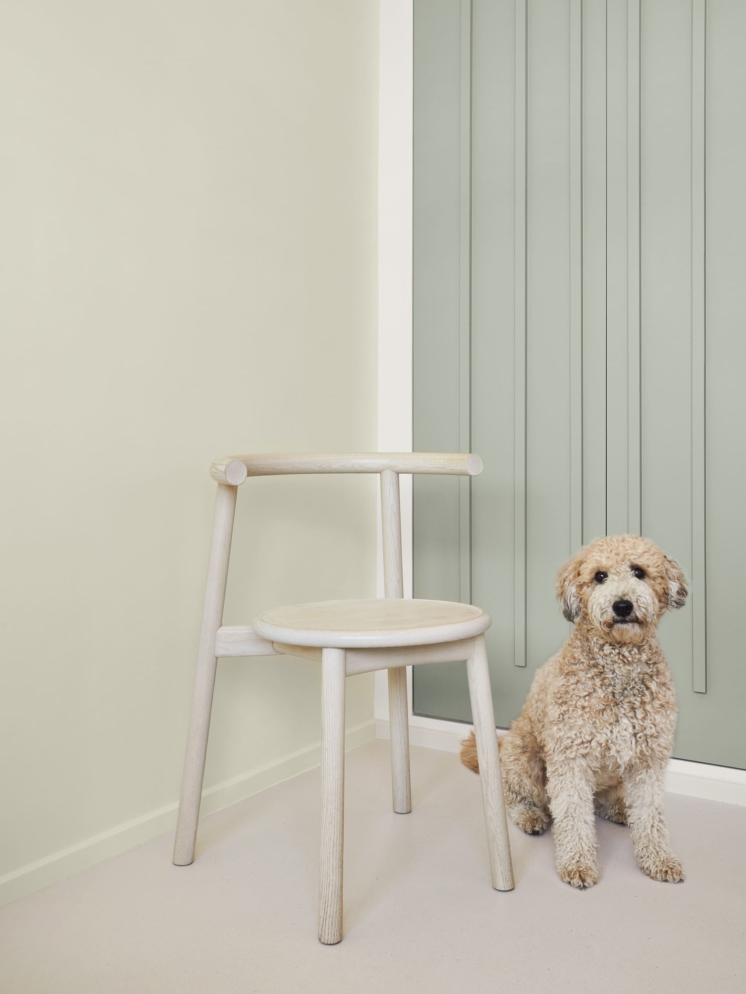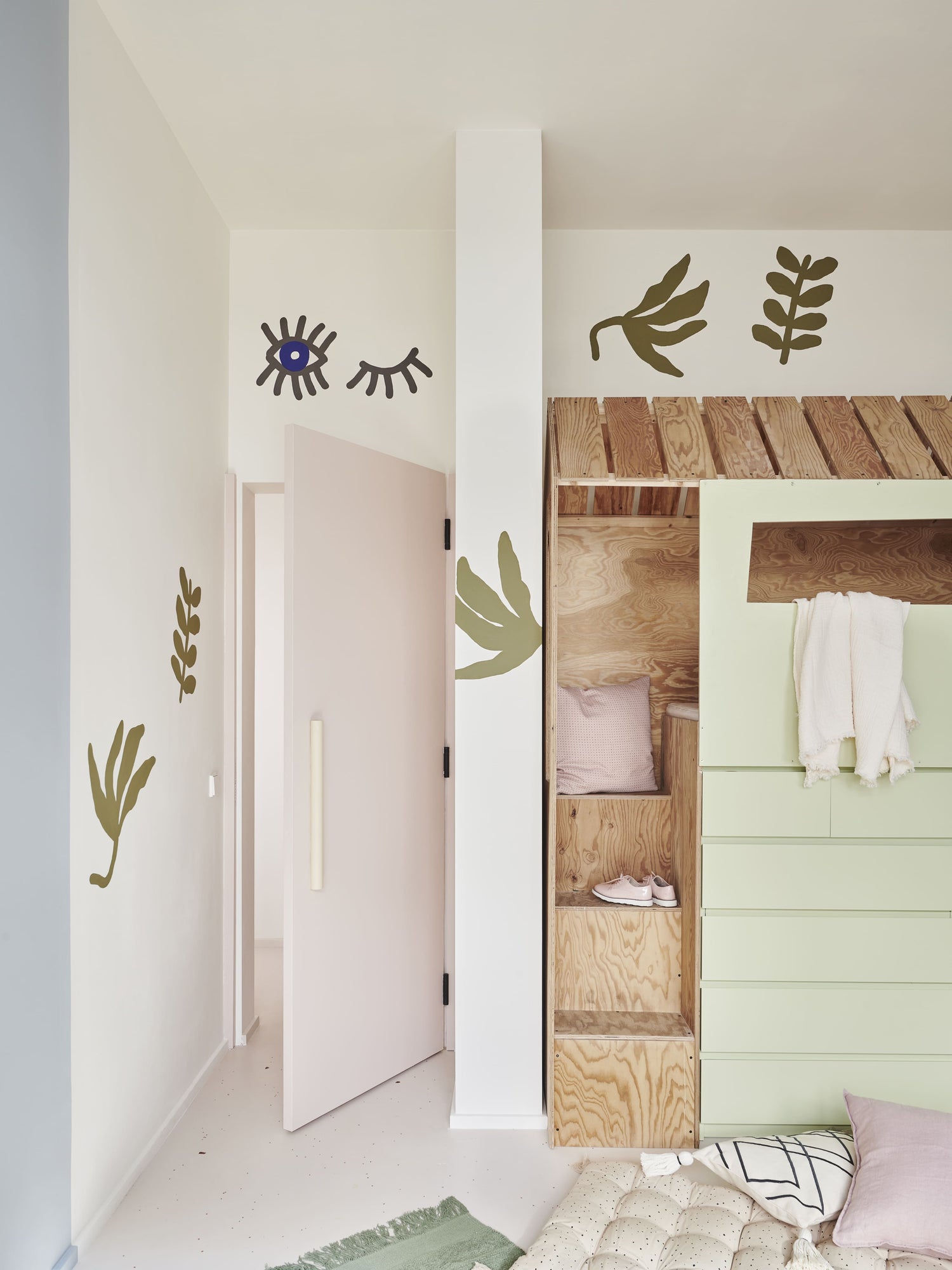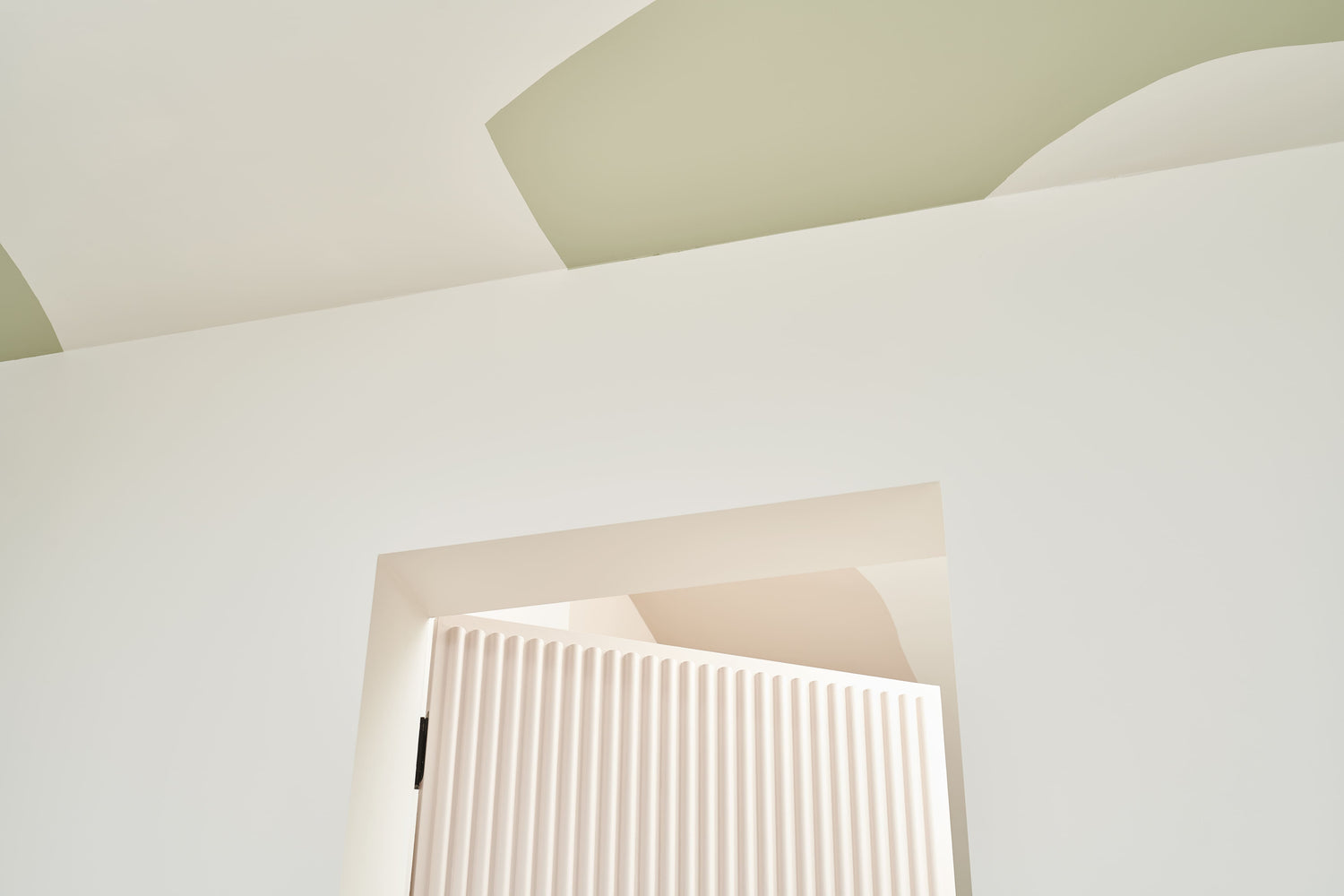 „Das Farbkonzept verfolgt unterschiedliche Ziele und Gedanken, da wir bei der Gestaltung das Thema Farbe nicht eindimensional denken wollten. Hebt es an der einen Stelle sichtbar hervor, homogenisiert es an anderer Stelle Flächen und Möbel. Zum Teil verläuft ein Farbton auch von der Wand über Decke und Tür hin zu einem Möbelstück, oder die Farbe spiegelt sich in einer Schattierung von Einbauregalen. Trennt man sich einmal von der Vorstellung, dass Farbe nur in einer Nuance auf die Wand gehört, eröffnen sich unzählige Möglichkeiten“, so Kilian Schindler._