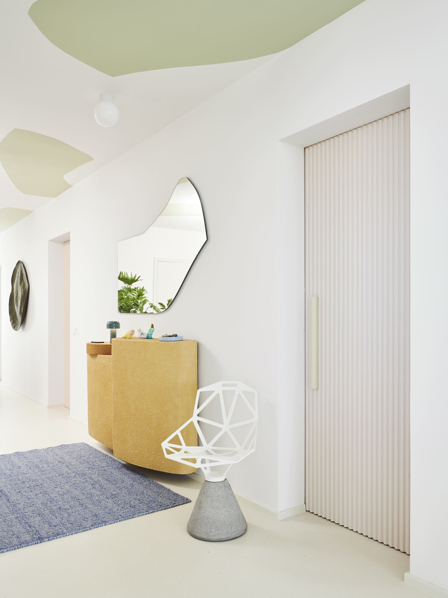 Definierte organische Formen, die sich in Form von Farbflächen, Spiegeln und Teppichen als Thema durch die ganze Wohnung ziehen, setzen gezielt stilvolle Akzente und bringen Lebendigkeit in das Ensemble. Durch den großzügigen Einsatz zahlreicher Farben herrscht in allen Räumen eine heitere, freundliche Stimmung._